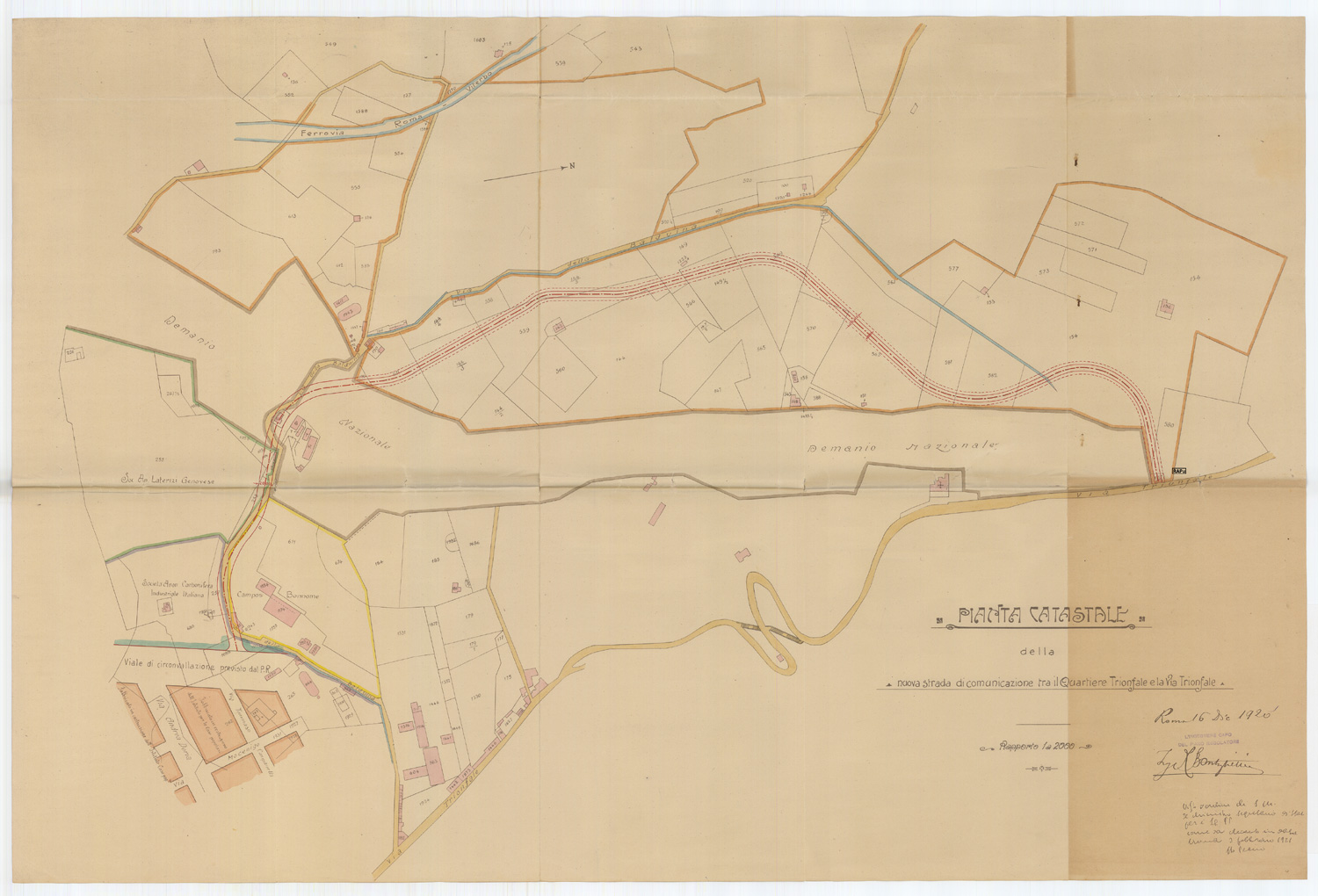 Pianta catastale della nuova strada di comunicazione tra il quartiere Trionfale e la via Trionfale scala 1:2000. -1 tavola : color. ; 103 x 68 cm